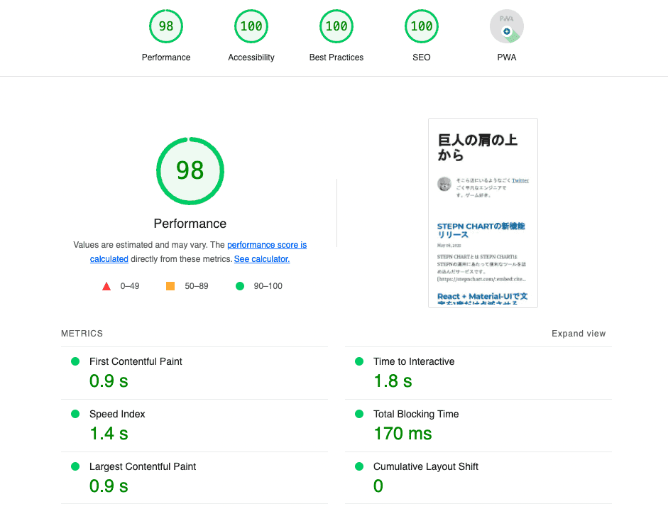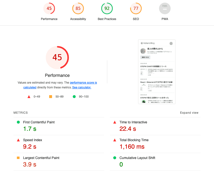 まずわかりやすい点ではLighthouseのスコアがかなり上がりました。まあはてなブログが巨大なWebサービスなのに対して、Gatsbyは実質こじんまりとした静的サイトなのでそりゃそうかという感じではありますよね。